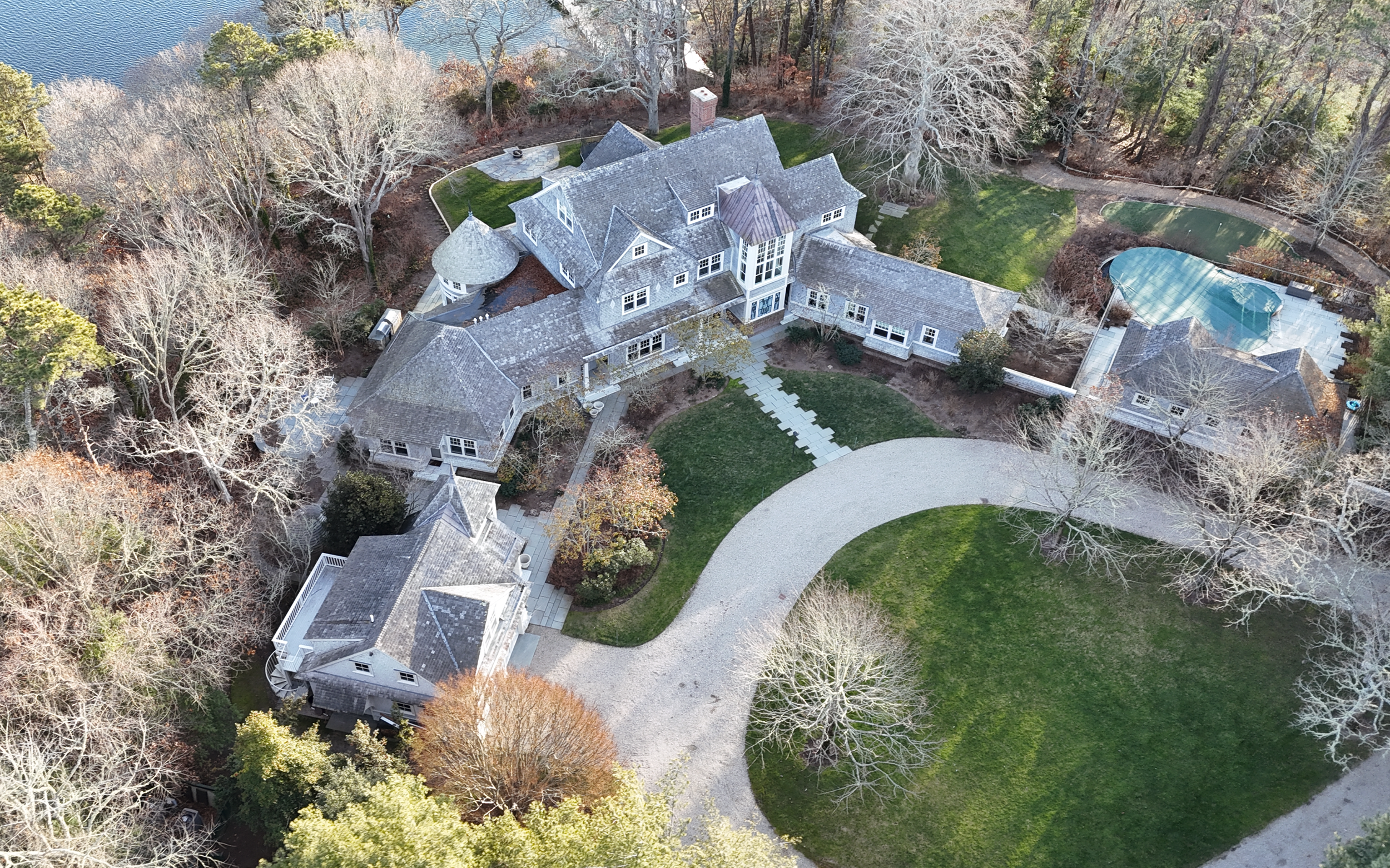 This coastal South Shore property in Hingham, Massachusetts blends classic New England architecture with a thoughtfully designed landscape that includes a main residence, carriage house, tennis court, and supporting outbuildings.